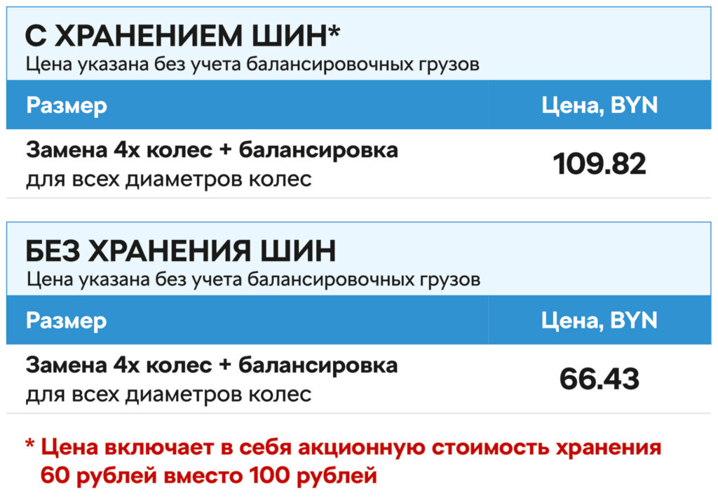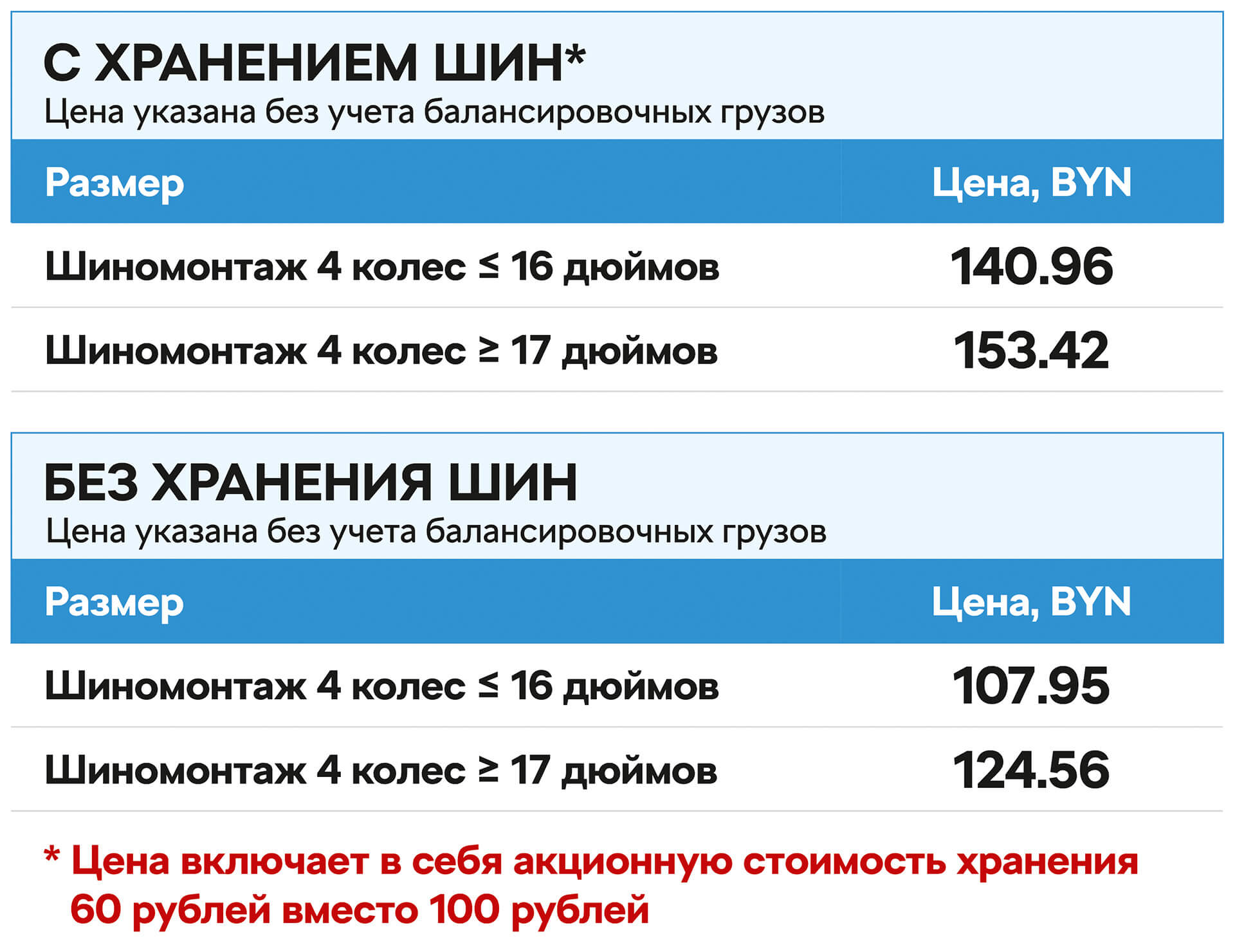 При покупке новых шин через акт выполненных работ (через заказ-наряд) стоимость хранения составит 12 BYN.